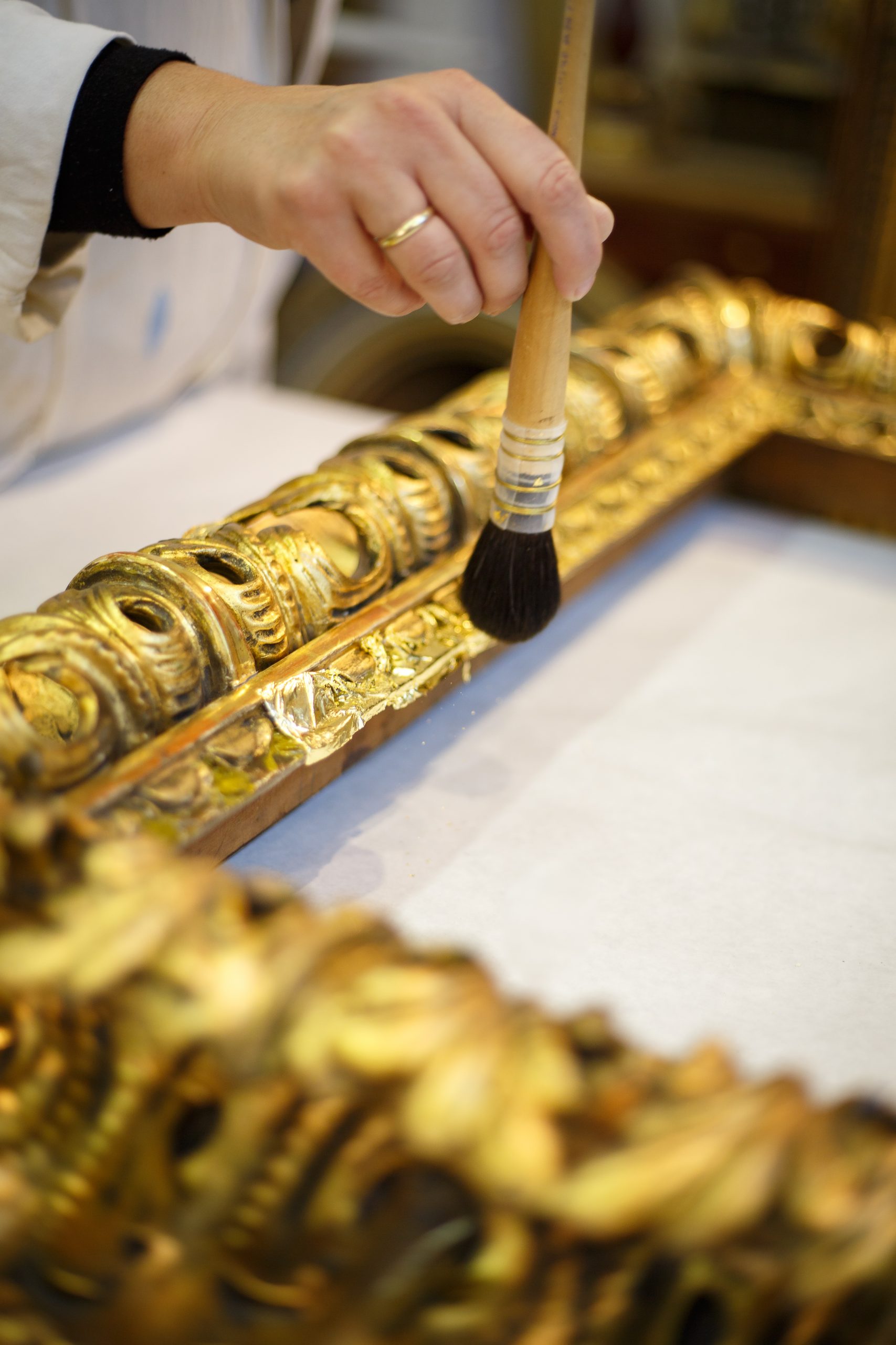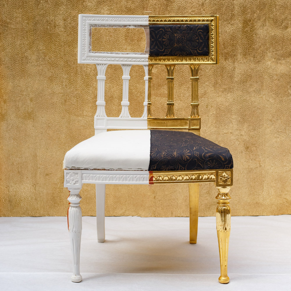 Häufig erneuere ich Vergoldungen und hauche Objekten damit neues Leben ein. Gleichzeitig ist das Restaurieren im Atelier GoldRichtig ein weites Feld: Ich biete etwa auch das Ergänzen fehlender Ornamente an und arbeite mit Holzschnitzern und Tischlern zusammen, um Ihnen restauratorisch und kunsthistorisch hochwertige Arbeiten zu garantieren.